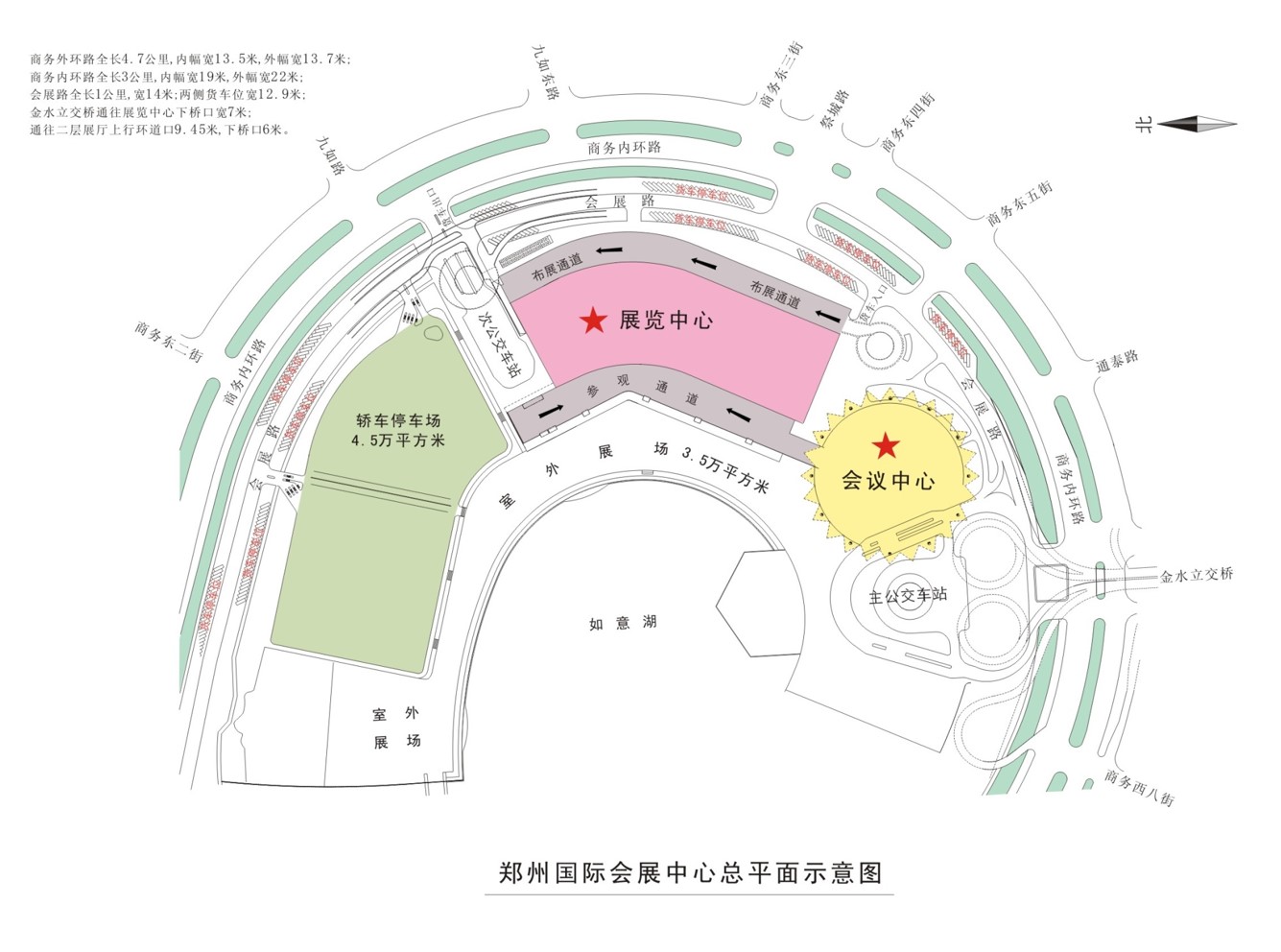 首頁展館介紹場(chǎng)館設(shè)施文章詳情 文章詳情 總平面示意圖及立體圖 鄭州國(guó)際會(huì)展中心建筑面積22.68萬平方米,其設(shè)施包括會(huì)議中心、展覽中心、1.7萬平方米的室外展場(chǎng)及4.5萬平方米的室外停車場(chǎng)。