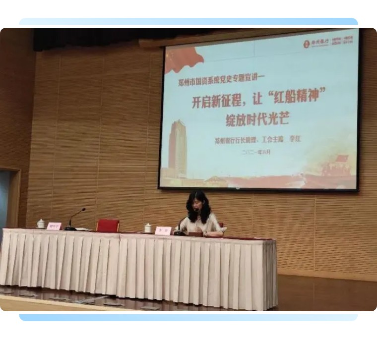 公司黨委邀請(qǐng)鄭州銀行助理、工會(huì)主席李紅同志為公司全體職工做了《開啟新征程,讓“紅船精神”綻放時(shí)代光芒》的主題演講。李主席以“紅船精神”為著力點(diǎn),以自身工作經(jīng)歷為出發(fā)點(diǎn),通過具體的事例讓大家了解鄭州銀行如何在把握時(shí)代脈搏、引領(lǐng)黨建工作中的擔(dān)當(dāng)進(jìn)取、創(chuàng)新發(fā)展。如何以自身作為表率詮釋著黨員先鋒模范帶頭作用。