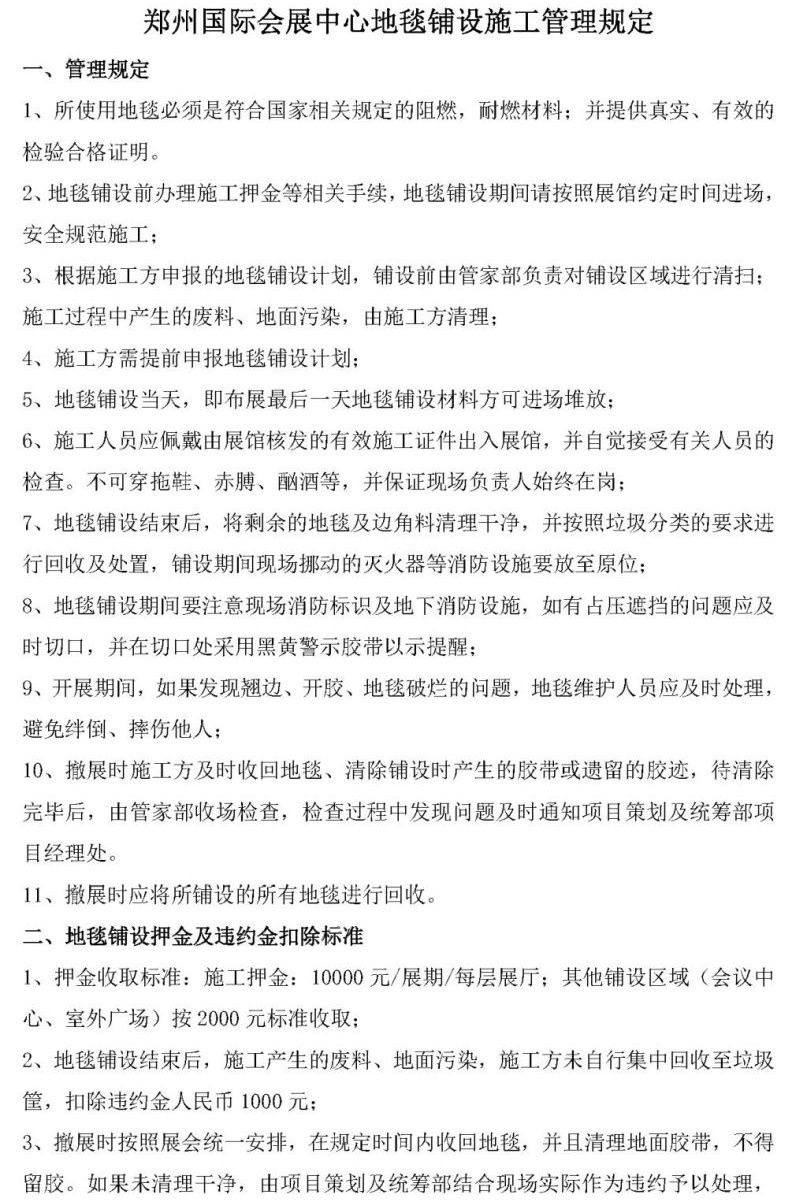 首頁(yè)服務(wù)指南下載中心文章詳情 文章詳情 地毯鋪設(shè)施工管理規(guī)定 鄭州國(guó)際會(huì)展中心地毯鋪設(shè)施工管理規(guī)定 《鄭州國(guó)際會(huì)展中心地毯鋪設(shè)施工管理規(guī)定》文檔下載