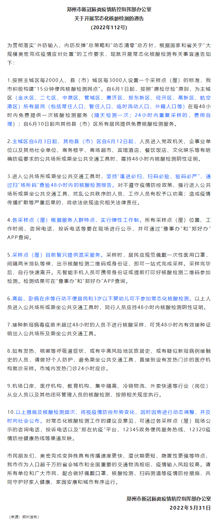 【轉(zhuǎn)載】鄭州市新冠肺炎疫情防控指揮部辦公室關(guān)于開展常態(tài)化核酸檢測(cè)的通告