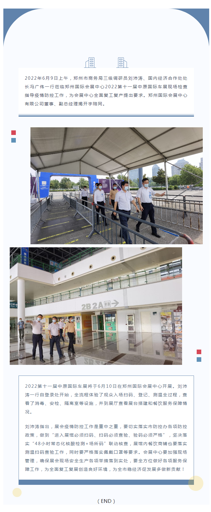 2022年6月9日上午,鄭州市商務(wù)局三級(jí)調(diào)研員劉沛濤、國內(nèi)經(jīng)濟(jì)合作處處長馮廣偉一行蒞臨鄭州國際會(huì)展中心2022第十一屆中原國際車展現(xiàn)場檢查指導(dǎo)疫情防控工作,為會(huì)展中心全面復(fù)工復(fù)產(chǎn)提出要求。鄭州國際會(huì)展中心有限公司董事、副總經(jīng)理揭開宇陪同。