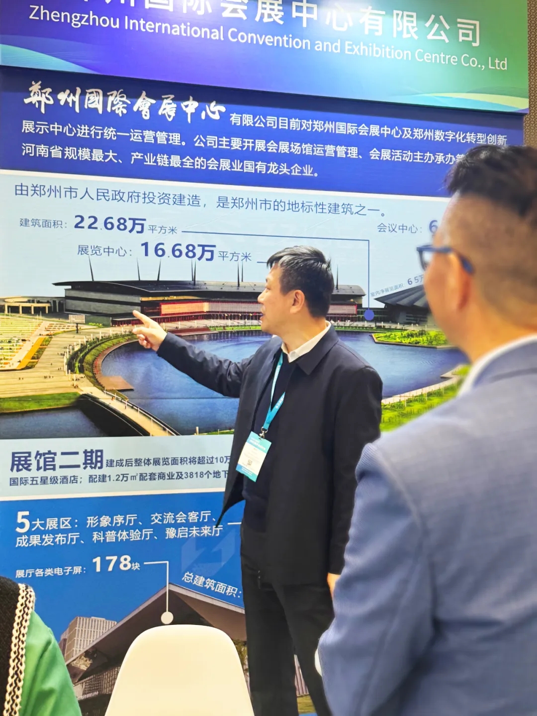 在持續(xù)一天的展覽展示環(huán)節(jié)中,鄭州國際會展中心有限公司黨委副書記、董事、總經(jīng)理揭開宇帶領(lǐng)公司營銷團(tuán)隊(duì)同與會嘉賓、參展代表及專業(yè)觀眾進(jìn)行廣泛溝通與對接洽談,全面介紹展館設(shè)施條件與運(yùn)營能力,深入闡釋鄭州市會展政策與資源優(yōu)勢。論壇期間,我公司所制作的會展精品短視頻在大會現(xiàn)場進(jìn)行了展播,同時入選的優(yōu)秀案例——“鄭州數(shù)字化轉(zhuǎn)型創(chuàng)新展示中心”被收錄于主辦方匯總印發(fā)的紙質(zhì)版案例集,面向全體參會代表分發(fā)。